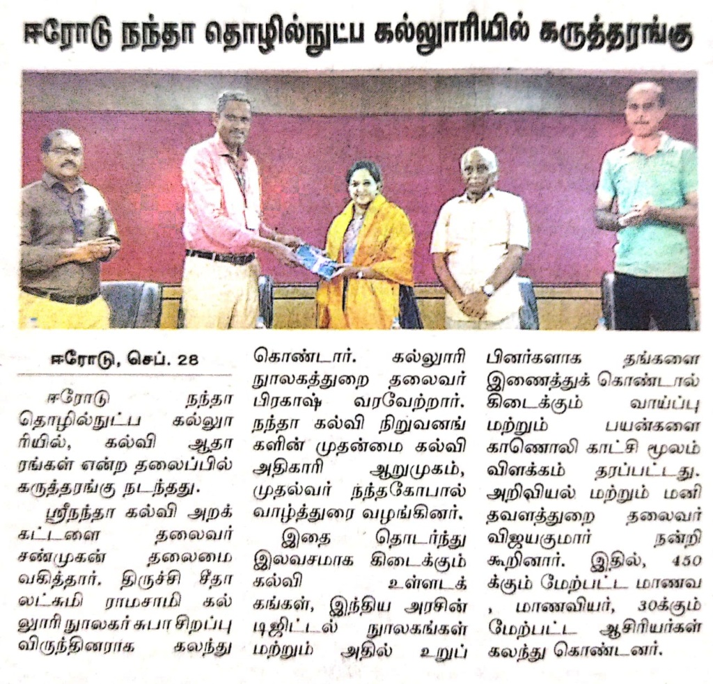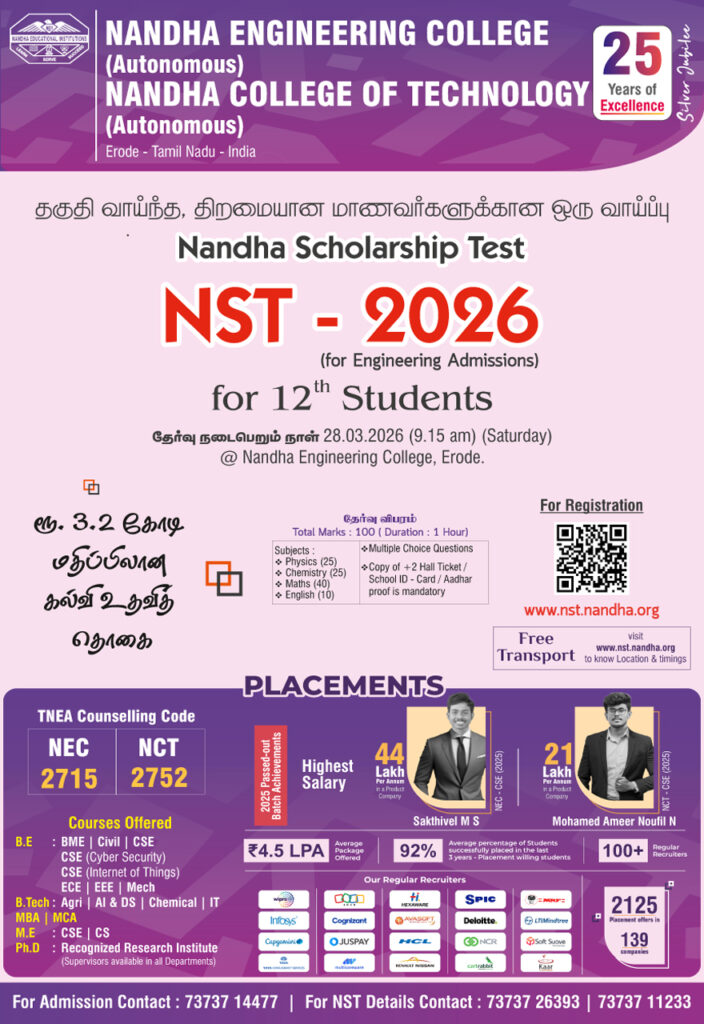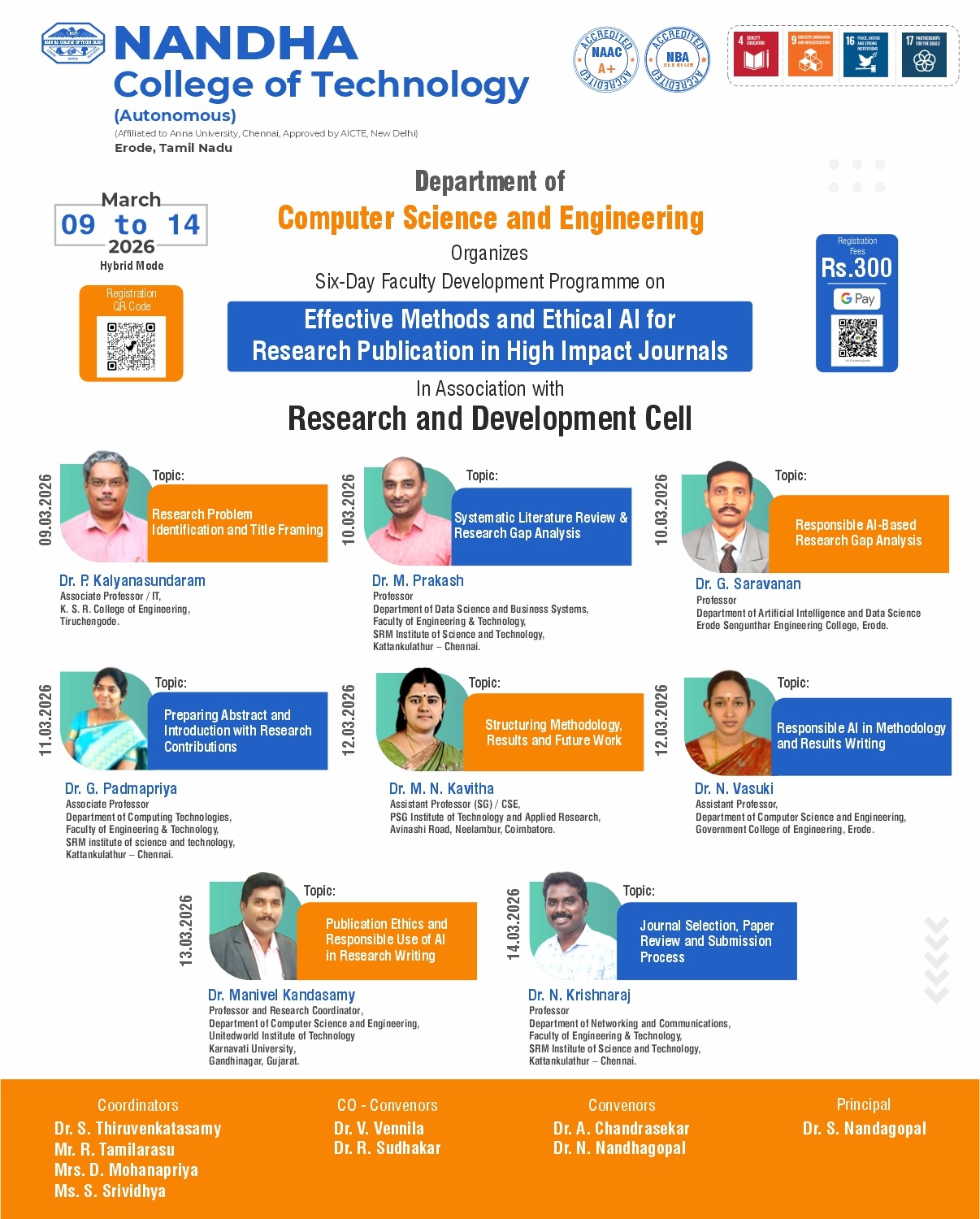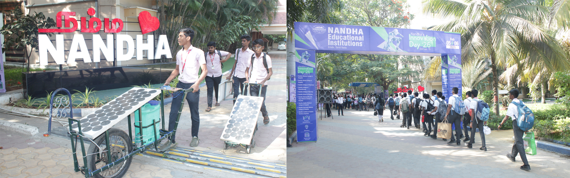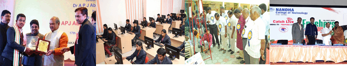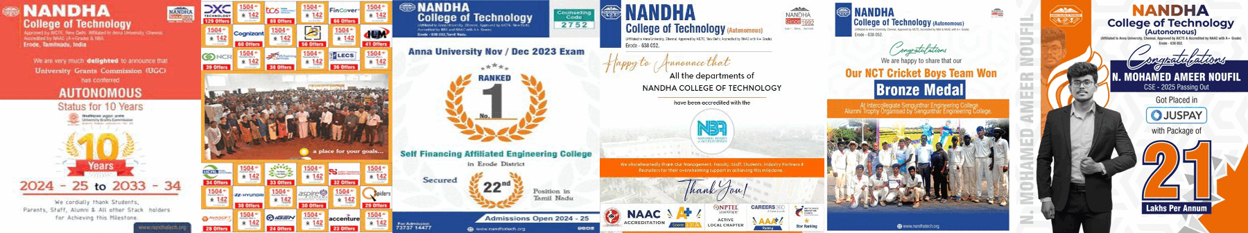 Nandha College of Technology is an Self-financing Engineering College, Approved by AICTE, New Delhi and Affiliated to Anna University, Chennai.NCT campus provides environment for learning in harmony with nature, away from the odds of the city life. The spacious and the earth hugging buildings punctuated with landscaped courtyards and pathways are designed to emphasise the business ethics and or characteristics of an excellent centre for learning. The Campus hosts well planned academic blocks, computer centres, lecture halls, libraries, laboratories, conference halls,hostels.The Campus also have ATM,Gym and a clinic to attend to the general health of the students and staff.